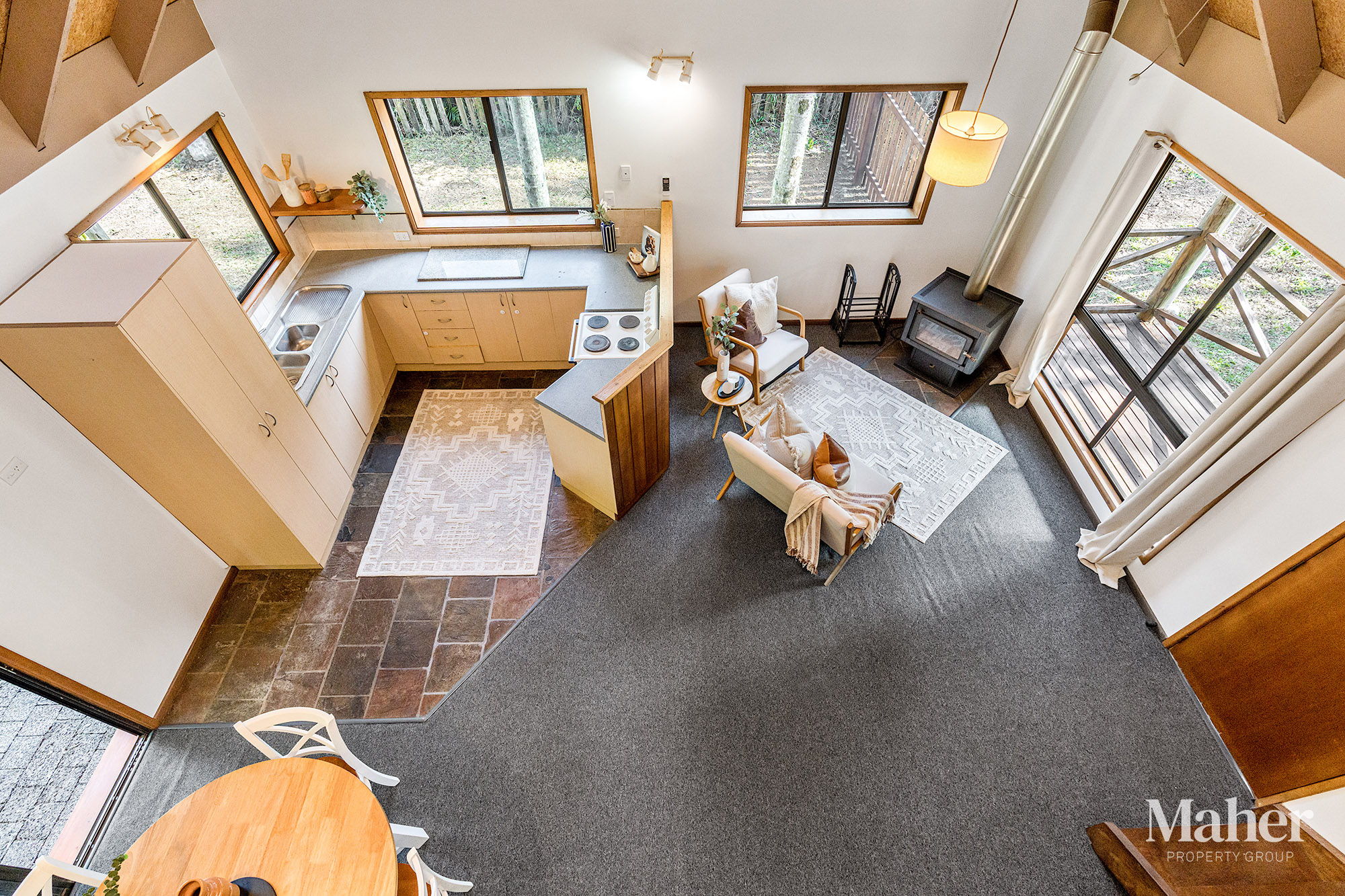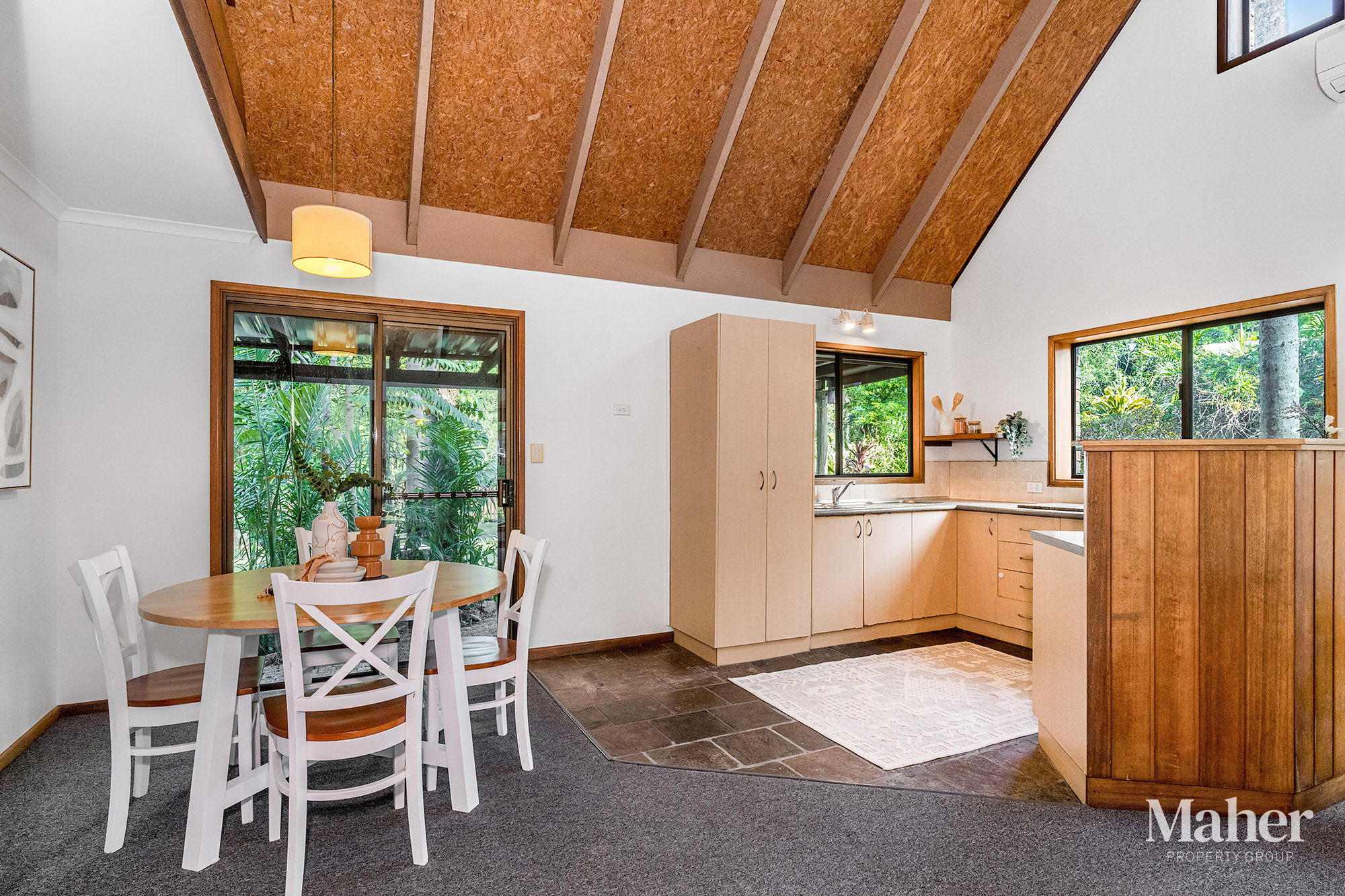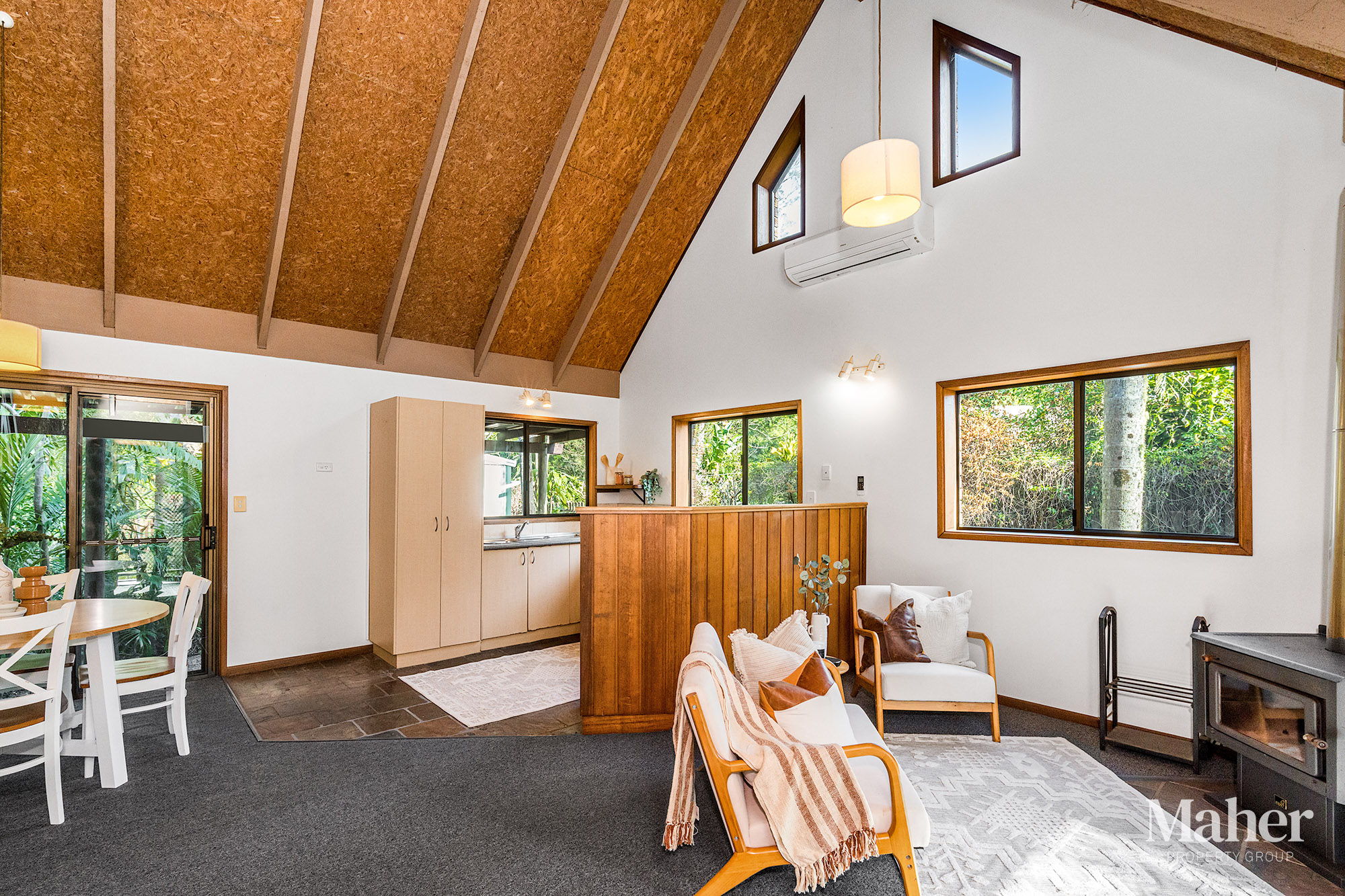 Inside, the light-filled open-plan kitchen, living and dining area creates a welcoming central hub for everyday living. Electric cooking appliances offer convenience, while the wood fireplace adds warmth and charm in winter. A newly installed reverse-cycle air-conditioning system ensures year-round comfort.
